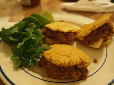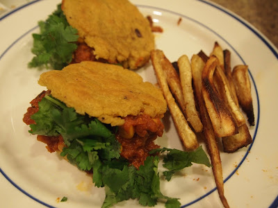 Then, I made a new dip: cannellini beans with roasted cashews, red peppers, garlic and parsley! It was delicious- I'll post it soon! On to another walk in the snow with Luna b. and some thesis work. Then, POOF it was 5:00 and Dave was on his way home. We made arepas stuffed with leftover chili, cilantro and Cabot and parsnip fries for dinner.