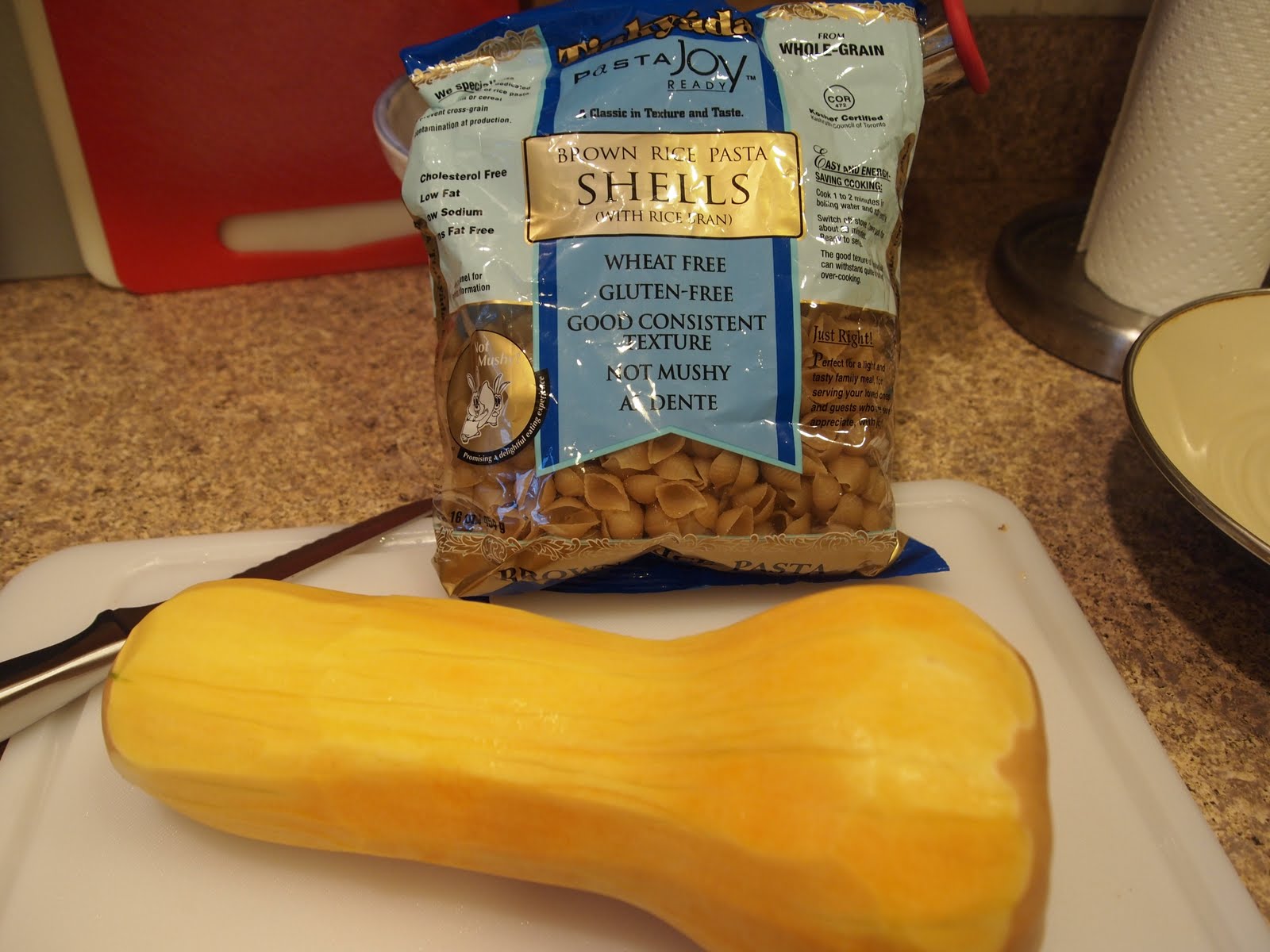 The beginning: Tinkyada pasta shells & a peeled butternut squash...