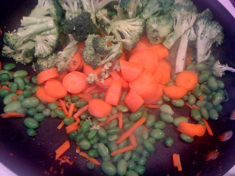 I then took the turkey out of the pan, and sauteed broccoli, edamame, carrots, and peas.